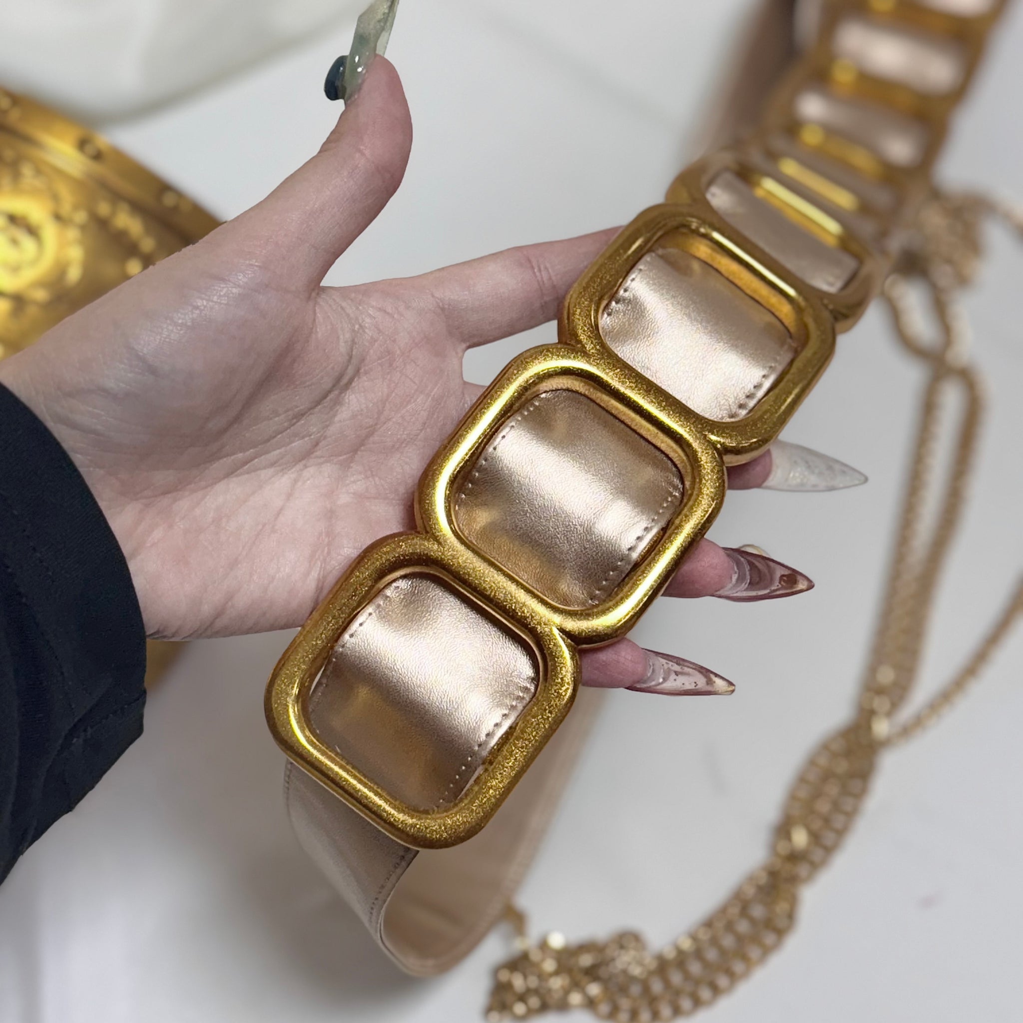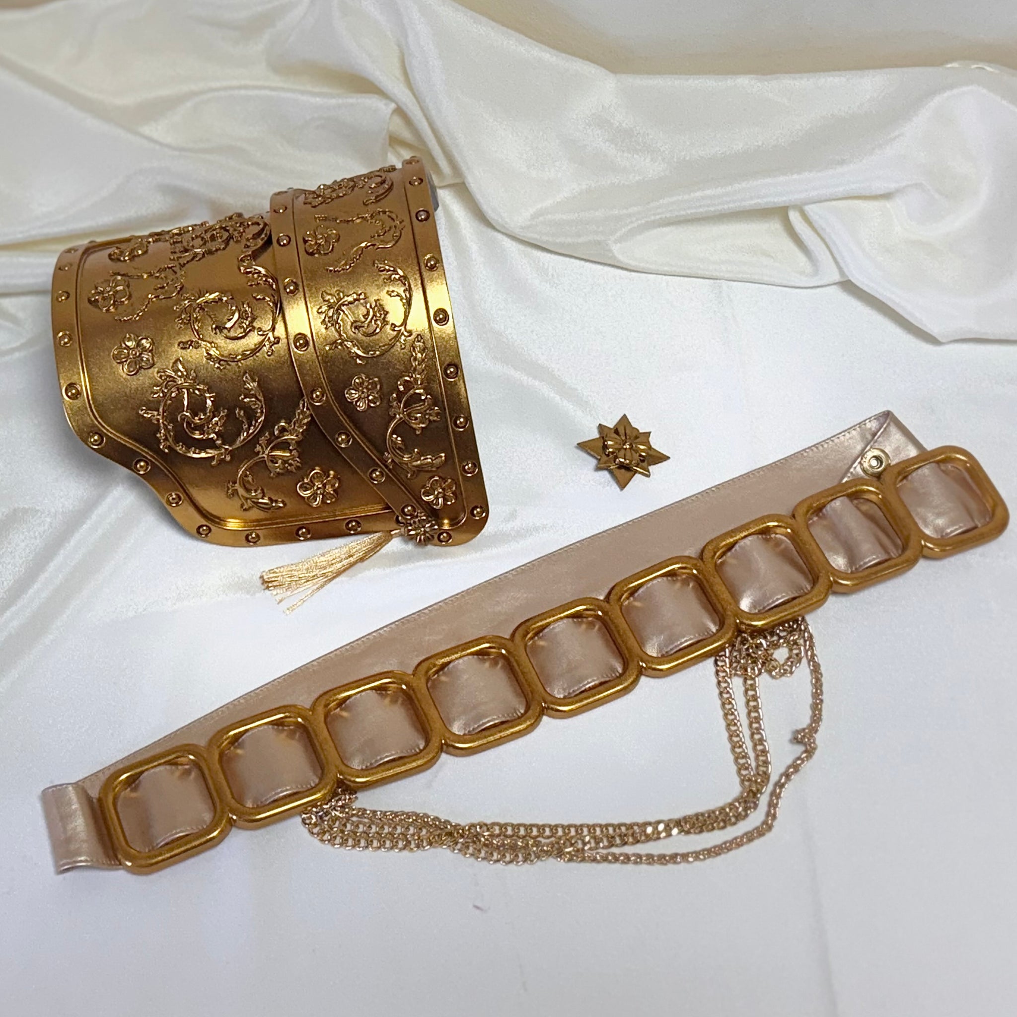 The set includes a shoulder piece, a belt, and a pin.